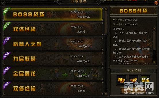 打BOSS爆装备!傲天赤月传说2游戏7大BOSS系统小编早已烂熟于心:无聊的时候打个人BOSS,野外刷新就去挑战野外BOSS,每天必须去一下BOSS之家,想要转生装备转生神殿是必须去的,还有诺亚遗迹、迷失大陆、VIPBOSS都是BOSS爆装备的好地方。为什么在傲天赤月传说2中一直没有见到过“BOSS战场”的存在?问得好,BOSS战场是每日下午15:30~16:00时间段的重要活动,专门为80级以上玩家开启的一场打BOSS狂欢。不太清楚的小伙伴跟随小编亲身去感受一下吧。