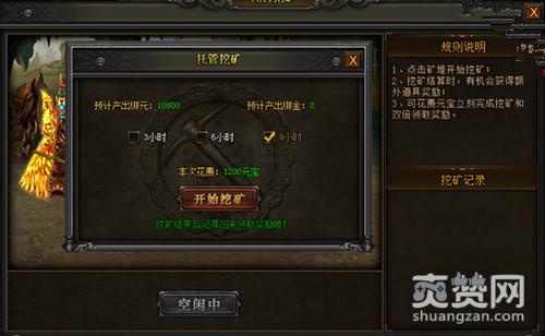 银矿和金矿需要花费元宝去挖,唯一不同的是银矿可以挖出少量的绑元和大量的绑金,金矿只能挖出绑元,但是在花费元宝方面金矿是银矿的一倍,结算时有一定机会获得额外道具奖励,花费元宝立即完成挖矿的话可以获得双倍奖励哦,还等什么,赶紧来战天挖矿吧!