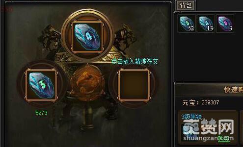 黑铁合成可以把低级黑铁合成高等级黑铁,3个同等级黑铁可以合成高一级黑铁,合成材料中有一个绑定,合成获得的高级黑铁即为绑定。合成黑铁有一点的几率失败,可以投放不同成功几率的精炼符文来提高合成成功率。