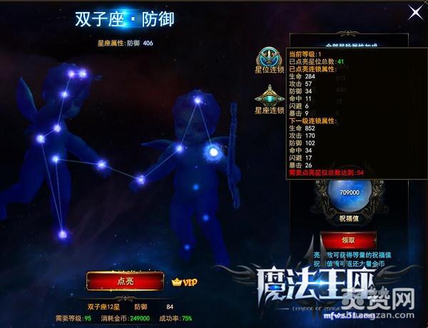 “星脉”系统是伴随着玩家在51《魔法王座》中的一系列历练的一个独特的成长体系,而“星脉”系统的灵感来源,则正是星座理论中最为核心,也最为大众所熟知的“黄道十二宫”,也即围绕星相学中太阳运行轨迹依次分布的白羊、金牛、双子、巨蟹、狮子、处女、天秤、天蝎、射手、摩羯、水平、双鱼等共计十二个星座。玩家在51《魔法王座》当中,随着角色的逐步成长,会在“星脉”系统当中逐步点亮上述十二星座,并获得十二星座所给予的能力加持,从而全面提升自己的攻击、生命、防御、命中、闪避以及暴击等各项属性,大幅提升战力!