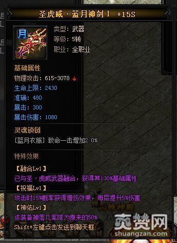 圣虎威·蓝月神剑I。类型:武器,等级:5转,职业:全职业。基础属性——物理攻击:615-3078,生命上限:2430,准确:480,暴击:300,暴击伤害:1080。灵魂锁链——【蓝月衣服】:致命一击增加2.0%。特殊效果——【融合Lv1】:已与圣·虎威武器融合,获得其130%基础属性。【祝福Lv1】:攻击时15%概率获得增伤效果,每层提升5%伤害。【神佑Lv1】:该装备掉落几率降为原来的50%。