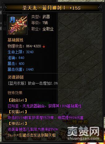 圣天龙·蓝月神剑I。类型:武器,等级:7转,职业:全职业。基础属性——物理攻击:864-4320,生命上限:3240,准确:480,暴击:400,暴击伤害:1440。灵魂锁链——【蓝月衣服】:致命一击增加2.0%。特殊效果——【融合Lv1】:已与圣·天龙武器融合,获得其130%基础属性。【祝福Lv1】:攻击时15%概率获得增伤效果,每层提升5%伤害。【神佑Lv1】:该装备掉落几率降为原来的50%。