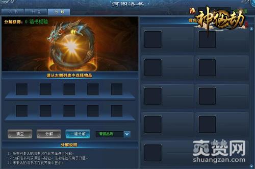 4366《神仙劫》的河图洛书还有等级,在此我们可以把它称为星级。每个洛书满级是10星,每成功升级1颗星,洛书可增加额外的升星属性。什么?经验从哪里来?别急,我来告诉你。当你收集到不太心仪的洛书时,我们可以把激活的洛书进行分解,从而得到洛书经验,这个经验就可以用于升星了!