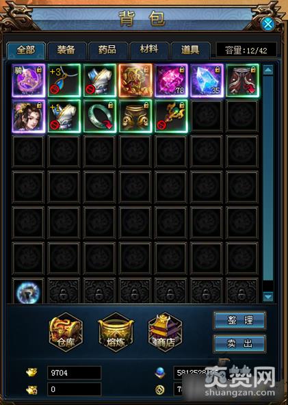 背包界面有: 五个标签-【全部】【装备】【材料】【道具】【药品】,点击不同标签可以查看不同类型的道具。 三个图标-【仓库】【熔炼】【整理】【商店】。 二个按钮-【整理】【卖出】 在界面底部,可以直接看到当前所拥有的【元宝】【礼金】【精元】【铜钱】的精确数量。 1、物品整理 点击【整理】按钮,物品会按需自动排列,重复的道具会自动叠加。 2、卖出物品 点击【卖出】按钮,背包框进入卖出状态,左键点击相应物品变回卖出。