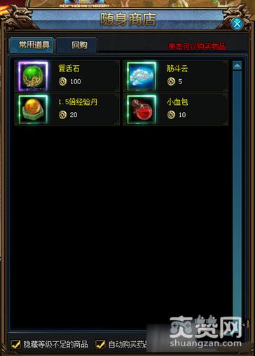 点击背包界面中的【商店】按钮,可以进入上图所示的个人的随身商店,玩家可在其中购买常用的道具。