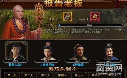 报告老板中包含四大板块,分别是蘑菇头制片、大波浪导演、王牌编辑与土豪老板,蘑菇头制片会对新区开服七天以内,每天坚持登陆上线的玩家,给予海量奖励,其中每天必有一本屠龙秘籍。大波浪导演则是能对每天达到规定活跃度的玩家,赠予屠龙秘籍,一旦活跃度爆百,一次性送你两本,可以用这些秘籍来兑换神戒哟!