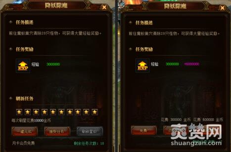 都说持之以恒是每一个男人都应该具有的美德,只要功夫深,日积月累也能水滴石穿!49you《烈火封神》“降妖伏魔”玩法,将会教会男人们:论持久力的重要性。其实每日的降妖除魔任务非常简单,只需要击败相应数量的怪物即可,当玩家完成任务后还可以选择支付少数的金币获取三倍经验的奖励,非常超值!但是相对比较麻烦的就是,任务量非常之大,可不是一般男人能够承受的哦。当然,你还有一个捷径就是成为VIP会员,一键自动完成满星任务并且还能获得三倍经验!享受飞一般的感觉!