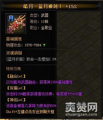 皓月·蓝月神剑II。类型:武器,等级:11转,职业:全职业。基础属性——物理攻击:1820-9097。灵魂锁链——【蓝月衣服】:致命一击增加3.0%。特殊效果——【融合Lv2】:已与天龙武器融合,获得其150%基础属性。【祝福Lv2】:攻击时20%概率获得增伤效果,每层提升5%伤害。【神佑Lv2】:该装备掉落几率降为原来的25%。