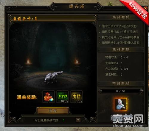 在8090赤月传说2通天塔的玩法中还可以获得大量的属性加成哦,通关的层数越高获得的属性加成也会越多,值得注意的是每天大家只有3次的免费机会,机会用完了就是需要花费元宝了哦。