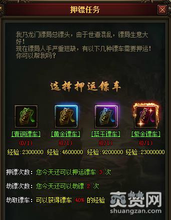 就来玩《天神战》开服在即,游戏新颖,玩法奇特,接下来就让小编为大家介绍一下押镖系统玩法吧? 在无双城的镖局统领处每日接受押镖任务。 镖局这个行当始终都是刀口舔血的营生,镖车押运之路也充满了危险和未知,需要处处小心、时时警惕,一不留神就有可能倾家荡产,更甚至性命不保,因而勇于承接押镖任务的玩家都是真正的英雄!玩家在完成副本等任务时会有一定几率获得镖令,当玩家拾取镖令后,便可以前往无双城承接押镖任务,每位玩家每天可以领取镖车3次。