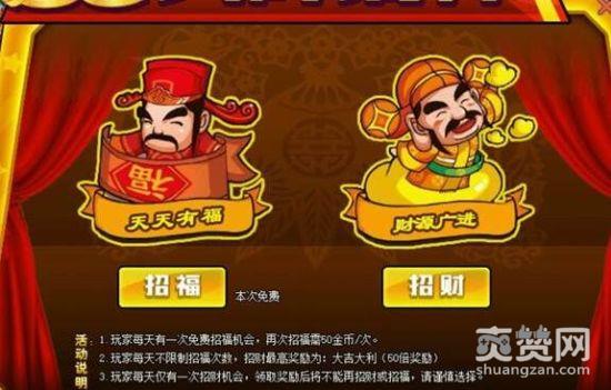 活动内容: 活动期间,玩家可通过点击游戏上方的图标进入活动,按照不同的福缘获取不同倍数的招财奖励。 玩法说明: 1.活动期间每位玩家每天可参与一次。 2.天降财神活动中共有福神与财神两位神仙,玩家需先点击福神进行招福,不同的福缘代表不同的奖励倍数,每天的首次招福免费,后续每次招福消耗50金币,单日招福不限制次数,直至达到最高福缘。玩家招福后可进行招财,招财奖励X招福倍数即为当日奖励 活动二:幸运红包 活动时间:更新后——2017年2月5日23:59