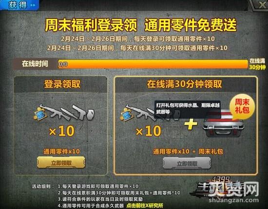 活动期间,每天登陆可领取通用零件*10;每天在线满30分钟可在领取通用零件*10+周末礼包*1!