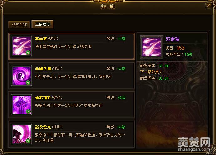 三清道法则是被动技能,被动技能可提升部分技能效果以及提升角色伤害或防御效果,因为每个角色不同,这里就不一一介绍了,详细可在游戏中自行体验,技能提升同样是需要消耗灵气和银两。