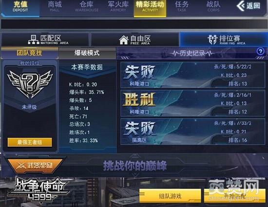 登录《4399战争使命》,点击右方的排位赛,即可进入排位赛界面。排位赛有两种模式,分别为团队竞技和爆破模式