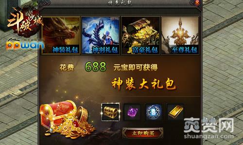 神装礼包是ppwan《斗破沙城》中的第一大礼包,也是需要花费最小的礼包,但是收获却不少哦!购买神装礼包,即可获得60级装备宝箱、200万经验丹、高级BOSS召唤令和10万金条!其中,60级装备宝箱开启后将会获得本职业60级强化+5装备一套,让你瞬间神装加身,实力倍增!