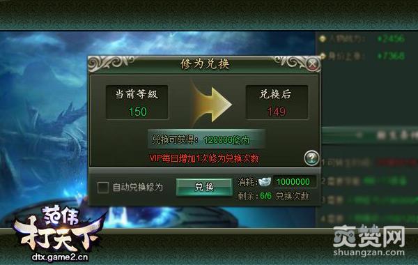 根据游戏设定,转生所需人物等级一定不会高于150级,所以玩家只要升上150级,并且在经验条达到90%以上未到100%时选择兑换修为,150级退到149级可以让玩家获得120000修为,而90%的留白距离,让你可以在一天之内再次达到150级,继而再次获得120000修为。