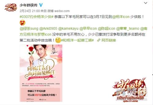 今年情人节之际,37《少年群侠传》在其官方微博上发起了以#0307约会杨洋少侠#为话题的表白大作战,玩家通过微博向杨洋说出自己的求爱宣言,带上话题并艾特官博,就有机会赢得现场见面名额,作为37《少年群侠传》杨洋后援会“铁血羊毛团”的代表,在3月7日举行的CIGC大会上见证男神风采,与男神一起同台互动。
