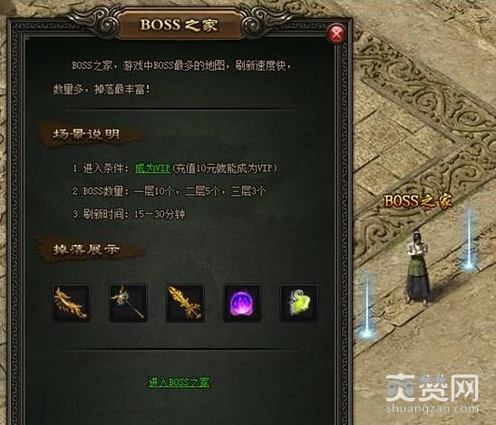 游戏中装备的重要性不言而喻,而想要极品装备必不可少要击杀BOSS啦,在哥们网《攻沙》中,BOSS之家正如它的名字一样,里面有着超多BOSS等你击杀,大量极品装备等你来爆哦!BOSS之家地图可从热砂荒漠中进入,不过可不是任何玩家都可进入的哦,需要VIP玩家才可进入,仅充值10元就可以成为VIP啦。