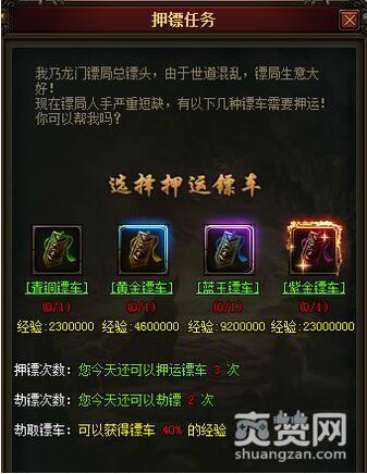 俗话说乱世出英雄,富贵险中求!押镖自古以来就有,虽然路途凶险,但是报酬十分丰厚,923yx《天神战》中的押镖亦是如此!虽然凶险,但其中也充满了紧张和刺激! 由于世道混乱,镖局生意大好,所以现在镖局人手严重短缺!押镖任务属于923yx《天神战》中的日常任务,而且在每天的16:00-16:30这个时间段押镖更是可以获得双倍收益!