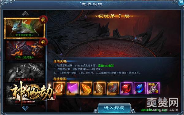 当然,在今日全新推出的魔界秘境玩法,你将更加不能错过!连通魔界的大门也将打开,强大的魔界妖魔、丰厚的掉落奖赏,都在这里等待你来开启!在魔界秘境之中,按照等级划分为一到五层,玩家将可以根据自身等级与实力选择加入,其中前三层为和平地图,四层以上即可自由PK,BOSS的掉落将按照伤害排名来决定归属,现在就加入到魔界秘境之内,挑战BOSS赢取装备,在360uu《神仙劫》里锻造只属于你的神装!