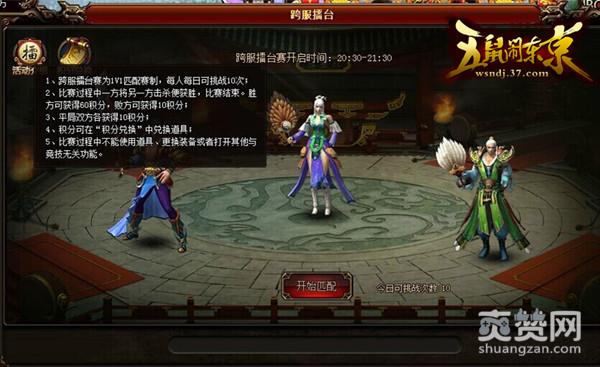在37《五鼠闹东京》跨服1V1中,玩家每天可参与10次竞技,比赛过程中一方将另一方击杀便可获胜,胜利方获得60积分,失败方获得10积分,如果不分胜负,打成平局,双方各获得10积分,这些积分可在“积分兑换”中兑换战力强劲的多样道具。天下英雄争豪强,无敌霸主不寂寞,该你接招了!