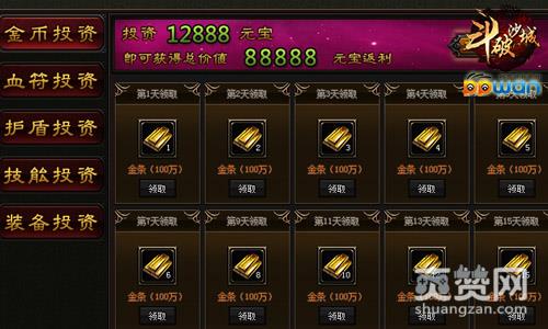 在ppwan《斗破沙城》中,五大投资返利分别为金币投资、血符投资、护盾投资、技能投资和装备投资。金币投资非常常见,即投资12888元宝后,15天共将获得总价值为88888的元宝返利。玩家每天都可以领取不菲的金币且数量越来越多,让你再也不用担心金币不够用了!