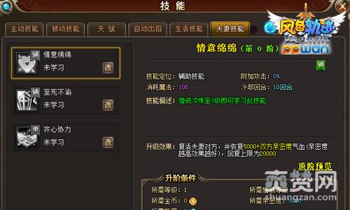 夫妻技能顾名思义就是夫妻间可以学习的技能。在ppwan《风色轨迹》中共有三个夫妻技能,两个辅助技能情意绵绵和至死不渝,一个单体攻击技能齐心协力。辅助技能主要是复活夫妻对方回复气血、为对方抵挡伤害的作用。而单体技能则可以与伴侣一起攻击敌方,附加伴侣攻击力,作战时夫妻档的夫妻技能往往可以力挽狂澜哦!