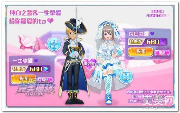 情侣特效服装一生挚爱套装&纯白之誓套装震撼首发。 想拿起剑保护你最亲爱的ta吗? 想为了你最亲爱的ta,披上婚纱吗? 现在向好友赠送情侣特效服装还可以获得同心结*10,让你们亲密度快速提升,马上就能喜结良缘哦! 快,把它献给你挚爱的ta吧! 购买地点:活动大厅-本周活动-情侣礼服全新登场 活动时间:2017年2月24日-3月2日 活动奖励:一生挚爱套装(男)、纯白之誓(女) 所需钻石:680钻石
