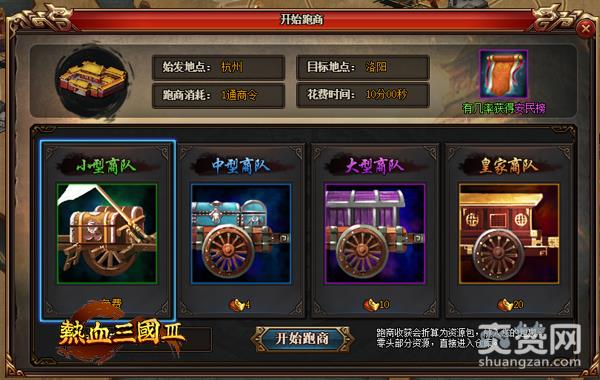 自力更生跑商赚钱,轻松成富翁!《热血三国3》最轻松的赚钱方式是什么?非跑商莫属。跑商系统具有几十个目的地,各个目的地解锁的方式不同,有战斗、道具收集、缴纳黄金等。每个目的地产出的资源不一样,玩家可以选取自己所缺的资源进行跑商,部分跑商地点还可以产出稀缺道具。于是乎各路商队横空出世,让玩家的黄金有地可循,发财变得不再是难事!
