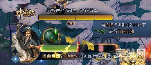 当玩家处于钓鱼区域时点击钓鱼开始钓鱼,钓鱼进度随时间增加,钓鱼进度达到100%时本次钓鱼成功,且每四次普通玩法出发一次特殊玩法,奖励翻倍!当然你也可以消耗一定的元宝获得次次奖励翻倍的道具。