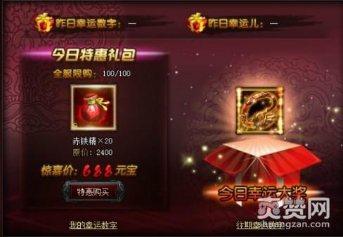 【活动内容】活动期间,每日均有今日特惠礼包,每购买一个礼包便随机获得一个幸运数字(1~100),每天晚上22:00公布幸运数字(1~100随机),幸运数字如有持有者,则当日幸运大奖就通过邮件的形式发送给中奖者,如没有则当日幸运大奖不发放。