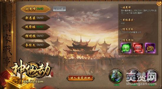 51《神仙劫》国家战事任务分为:破魔障、斩恶匪、攻祭坛、探情报、夺经文。 等级达到要求后,即可在国家战事页面上领取相对应的任务。完成任务可获得经验值、历练值以及装备升阶道具等奖励,祝你战力飞升!