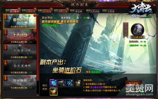 51《大青云》中副本种类繁多,尤以单人副本最多,一次通关、多次通关、多次挑战,看似很相像,实则大不同,对于玩家们来说,最爽快的必然是一次通关的副本了,这其中包括了变形地宫、上古战场、九曲黄沙阵和金光落魂阵。
