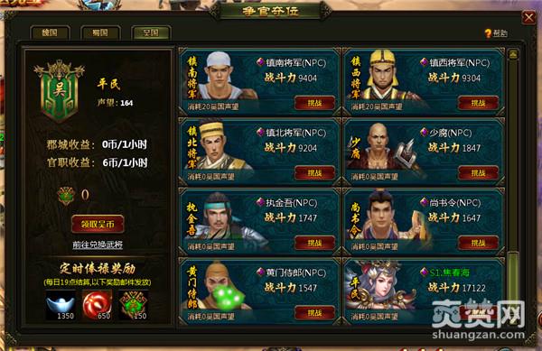 乱世风云三国鼎立,在404wan《战魔三国》之中,魏蜀吴三国分割占据了中原列土,而玩家们也将在游戏过程之中,选择一方实力加入,在加入之后,更可以争冠夺位领取俸禄!加入一国之后,玩家就可以挑战国中各位官员,挑战成功后即可获得该官位。拥有官职的玩家每天都将领取到属于自己的俸禄,拥有官职的玩家还将获得声望的奖励,通过声望玩家可以兑换到三国众多武将,官职玩法与变身系统在这里联系在一起,在404wan《战魔三国》内,赢取官职换取武将,开始你的征服之路!
