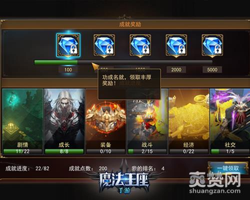 如此需要玩家日积月累才能逐渐达成目标的成就系统,当然并不只是积累成就点数那么简单——在《魔法王座》里,每当玩家积累成就点数达到一定阶段时,便可获得绑定钻石奖励,依据玩家的成就积累进度,奖励从100绑钻到最高5000绑钻不等——如此重要的福利岂容 错过?