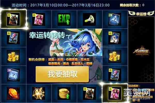 本期活动可以获得绝版英雄了,不仅在创世殿堂获得哦,快来看看吧~ 【活动主题】幸运转转转 【活动时间】 2017年3月10日——2017年3月16日23:00 【活动奖励】 关羽(永久)、花木兰(7天)、500金币、3级神石随机卡、复活石、天使护盾、50%金币加成卡(3战)、关羽(3天)、貂蝉(永久)、花木兰(3天)、200金币、黑炎(3天)、2级神石随机卡、小喇叭、 50%经验加成卡(3战)、貂蝉(3天) 【活动规则】 1、消费888钻石可获得一次抽取机会。 2、使用99钻石可以抽取一次 3、获得的奖励放到背包中。