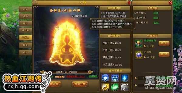 在腾讯《热血江湖传》中,金钟罩系统是游戏后期的核心玩法之一,每个玩家都对应有自己的金钟罩,可以使用道具对其进行升级进阶等操作,高级金钟罩不但可以为玩家抵挡伤害,还拥有多种不同的金钟罩技能。而相关道具则需要在金钟幻境的获得。