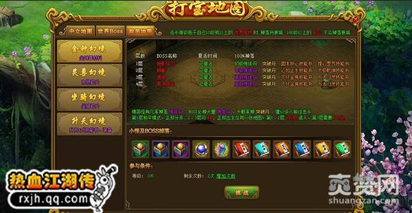 幻境地图是腾讯《热血江湖传》中的一大特色,在打宝地图的险恶地带界面中,共有金钟幻境、灵兽幻境、坐骑幻境、升天幻境四大幻境。而在新版本中,金钟幻境新增了第四层的全新内容,新的BOSS和怪物将在金钟幻境四层中依次登场。