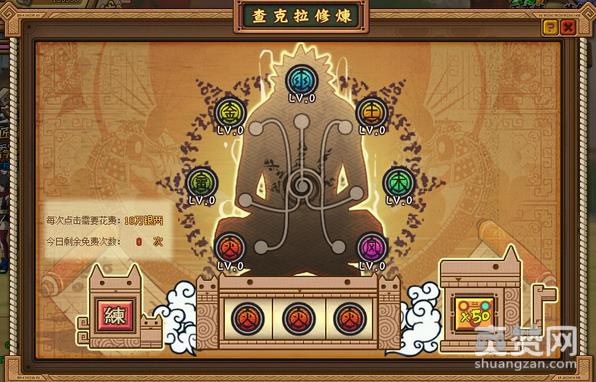 在游戏界面左边即可查看到查克拉修炼,每天有两次免费修炼查克拉的机会。当免费机会用完之后就要花费银两进行修炼了,虽然说修炼查克拉的花费比较高,但是对于战斗力的巨大提升是十分值得的。所以大家要想在忍界闯出一番天下,就经常进行查克拉的修炼吧。