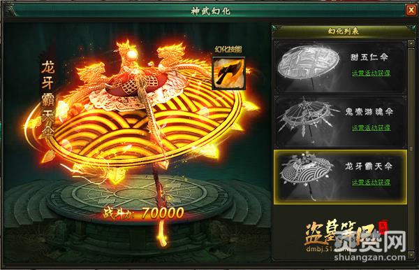 神武开启幻化后,即可获得幻化技能。目前游戏中神武幻化总共有三种幻化神武。甜五仁伞幻化技能花前月下可提高主角0.5%卓越一击概率、鬼索游魂伞幻化技能破釜沉舟可提高主角3%致命一击概率、龙牙舞天伞幻化技能与前者相同,但技能概率提高5%。三大神武均可通过运营活动获得。