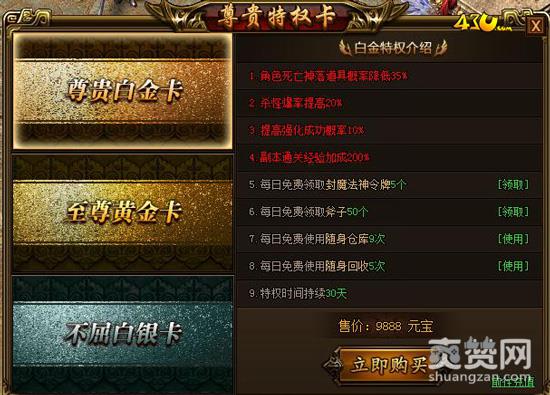特权二:白金卡,可享受当角色死亡掉落道具概率降低35%、杀怪爆率提高20%、提高强化成功概率10%、副本通关经验加成2倍、每日免费领取封魔法神令牌5个、每日免费领取斧子50个、每日免费使用随身仓库9次、每日免费使用随身回收5次,特权时间持续30天。
