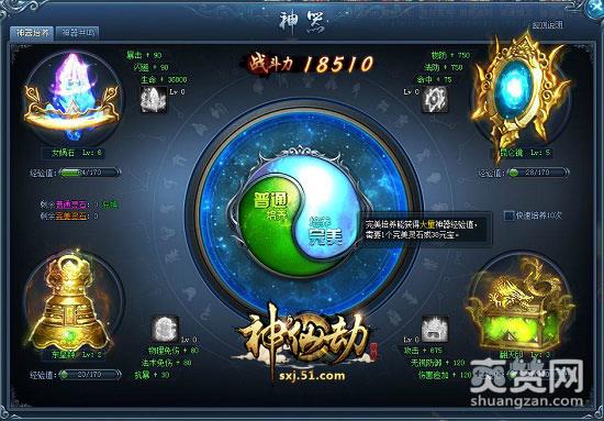 在51《神仙劫》的神器玩法中,共有女娲石、昆仑镜、东皇钟与翻天印这四大神器亮相,玩家们通过使用普通灵石或者完美灵石即可随机获取到一个神器碎片,并增加培养神器经验值,获取更强大的属性加成,目前玩家可直接购买灵石或者通过荣誉免费换取灵石培养。