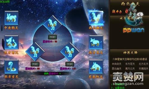天陨系统是ppwan《花千骨》全新的系统玩法,点开星宿活动界面就可以查看!天陨系统一共分为六大星宿,中央钧天、东方苍天、北方玄天、西北幽天、南方炎天和东南阳天。其中,中央钧天开放等级为80级,西北幽天开放等级为100级,东方苍天需要转生等级达到1级开放,南方炎天则需要玩家转生等级达到3级开放,北方玄天需要玩家VIP达到1级开放,最后 东南阳天需要玩家VIP等级达到3级开放。