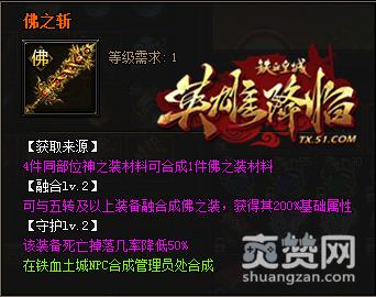 我们就拿佛之斩作为例子吧。先看一下基本属性,取决于所融合装备的基础属性,佛之装与5-14转装备完美融合,融合成功后继承被融合装备200%的基础属性。就是这么可怕这么强力,外形方面将采用佛之装的酷炫外形,当然小伙伴们也不用担心之前装备的强化和套装属性的丢失,这些都将会在融合之后统统继承到佛之装上。所谓四神装合成一件极品佛之装,属性与外观都得到了爆炸性的提升。