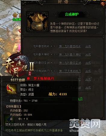 然而,9377《赤月传说2》近期的一次更新打破了这种磨人的困境。在游戏里,神装备已经不再是顶级装备了,圣装备荣登“皇者”宝座。与以往一样的是,玩家依然需要在土城NPC合成神炉出进行合成,合成需要2个相同的神级装备,再加上一些炼狱圣石就可以合成。
