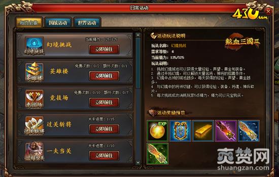 跑商、培养将领、升级、强化……,这些在《热血三国3》之中想要变强就必做的事情,做完了还能获得额外的奖励。在游戏中,通过日常活跃界面,玩家可以通过完成一些简单要求,稀世珍宝、黄金、器灵、紫装等奖励,都可轻易领取!而想得到这一切,所需要的只是正常的玩游戏就可以了!