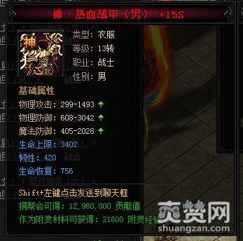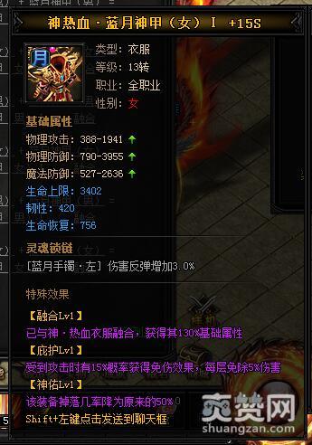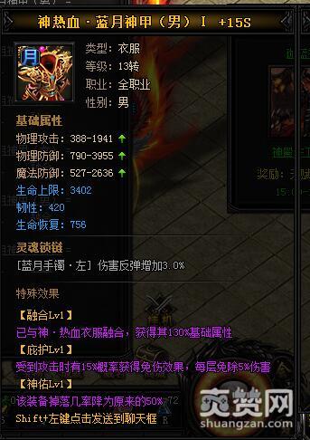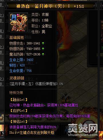 按照上述公式,就能合成神热血·蓝月神甲I,下面再让我们看一下它有哪些独特的属性和特殊效果吧。