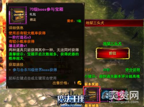 小编遭遇它时,已经无所畏惧,带上圣兽对其一顿暴打。即便不是真身的地狱三头犬实力也不容小觑,每一次攻击都有着超强的杀伤力,足足半分钟才将其搞定。也许此刻我们最该关心的是,都有什么样的奖励。首当其冲的是70级BOSS参与宝箱,使用后有较大几率获得一阶打造石*3,极小的概率可获得屠龙武器一把,只能获得其中一样。毫无疑问,对于初级51《魔法王座》玩家而言绝对是个好东西。