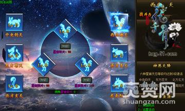51《花千骨》再次版本更新,史上最为强力的战力飙升风暴来袭,还有元素幻工,殷落羽翅膀幻化,铸就唯美仙侠! 天陨系统是51《花千骨》全新的系统玩法,点开星宿活动界面就可以查看!天陨系统一共分为六大星宿,中央钧天、东方苍天、北方玄天、西北幽天、南方炎天和东南阳天。