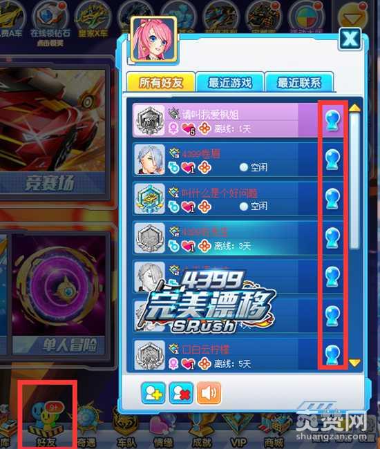 在游戏界面右下方点击好友,打开好友列表,点击列表中右侧的蓝色图标即可打开好友的个人信息面板。